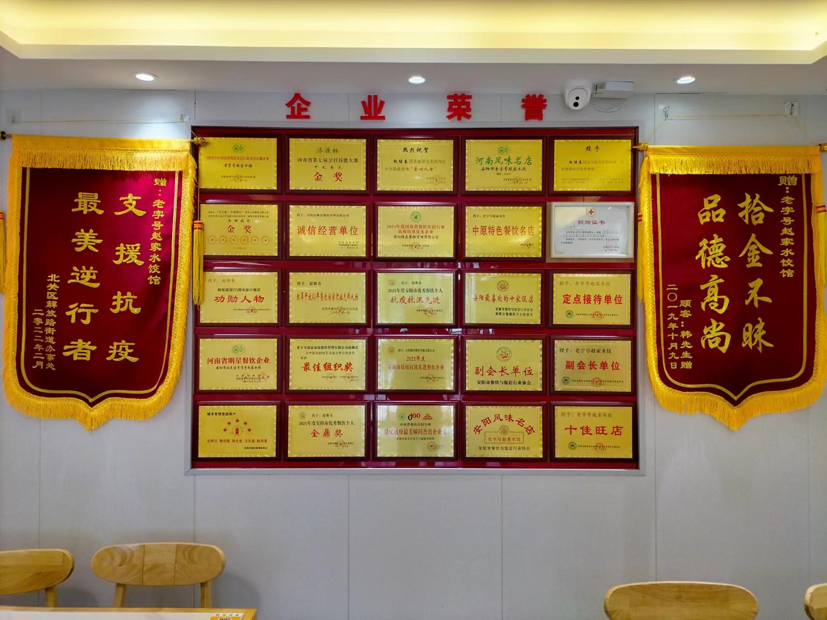 多年来,老字号赵家水饺在安阳餐饮界享有较高的知名度和美誉度,形成了自己的品牌。赵一道辣椒炒肉在中马美食文化厨艺交流赛中荣获最佳餐饮名店、2023年安阳市第一届彰德杯烹饪职业技能大赛荣获特金奖、在职业技能竞赛面点类荣获一等奖、安阳味道北关区特色美食一等奖,被授予河南省明星餐饮企业、河南省餐饮住宿行业百强企业、河南风味名店、中原特色餐饮名店、十佳旺店、安阳老字号等荣誉称号。