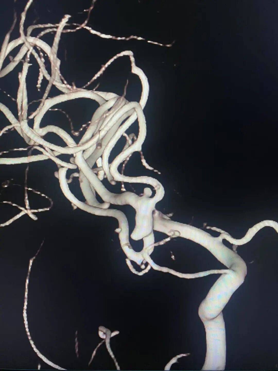 神经外科刘主任接到会诊请求后,迅速赶到急诊科。为进一步明确病因,决定为患者行头颈CTA检查。检查结果清晰显示,王大娘颅内存在大脑中动脉瘤,这正是导致其蛛网膜下腔出血的 “罪魁祸首”。