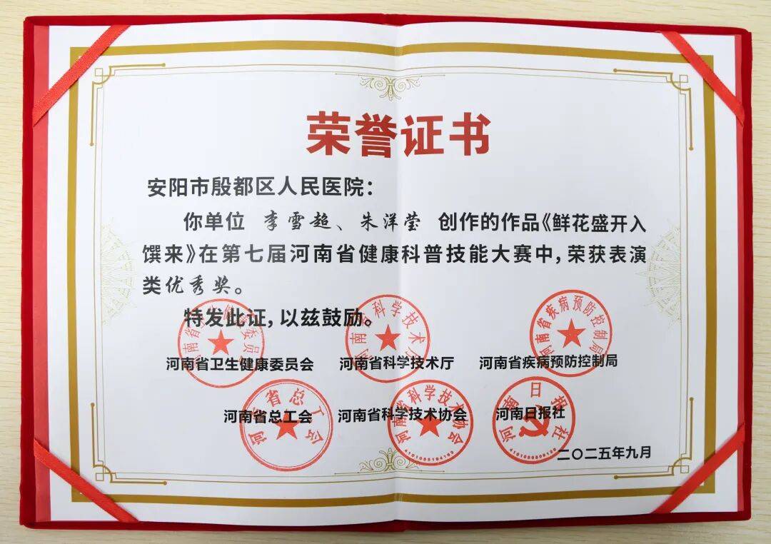在省级赛场中,我院医护人员同样展现出强劲的竞争力。由河南省卫生健康委员会、河南省科学技术厅、河南省疾病预防控制局、河南省总工会、河南省科学技术协会、河南日报社联合主办的河南省第七届健康科普技能大赛,作为全省健康科普领域的权威赛事,吸引了来自全省各级医疗机构的千余件科普作品参赛。大赛涵盖表演类、图文类、视频类等多个类别,通过层层筛选、专家评审的严格流程,最终评选出各类优秀作品。其中,我院李雪超、朱洋莹共同参与的科普作品《鲜花盛开入馔来》,以创新的表演形式普及药食同源知识,将传统养生智慧与现代健康理念相结合,内容实用、形式新颖,最终荣获表演类优秀奖,为我院在省级健康科普领域赢得了荣誉。