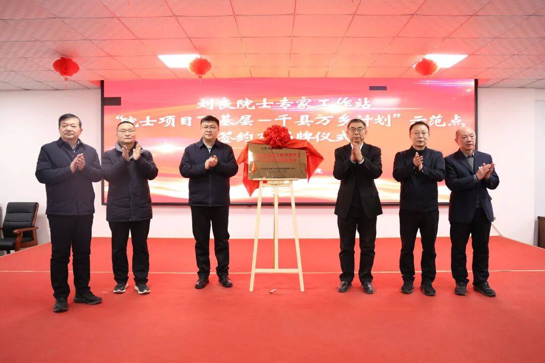 最激动人心的环节当属揭牌仪式。李燕平副站长、司晓剑书记、何治国总监、马显锋主任、郭华总院长共同上台,为“院士项目下基层—千县万乡计划示范点”揭牌。红绸滑落,掌声雷动,标志着示范点正式成立。全体领导嘉宾合影留念,定格这一重要时刻。