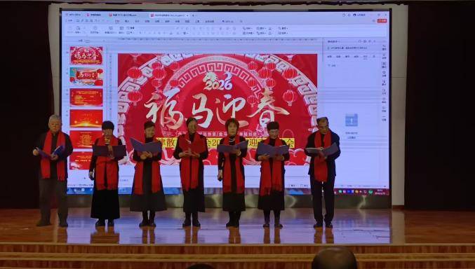 曹淑莲自创合诵诗歌《新年,你好!》,黄静、李兰芳、曹淑莲、李其林、范庆玲、王平精神饱满地走上舞台,满怀深情地回望2025的收获,展望2026的新征程,歌颂祖国,面向未来,铿锵有力的朗诵声和音乐声汇成一股强大的凝聚力。