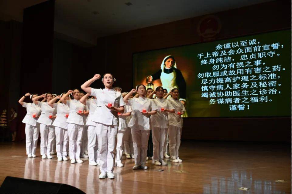 紧随着授帽仪式,全体护士进行了宣誓。护士们整齐划一,高举右手,巍然矗立。余谨以至诚,于上帝及会众面前宣誓:终身纯洁,忠贞职守。勿为有损之事,勿取服或故用有害之药。尽力提高护理之标准,慎守病人家务及秘密。竭诚协助医生之诊治,务谋病者之福利。谨誓!每个人都表现出了坚定和温暖的一面,每一句誓言都充满了责任感和使命感,表达出自己对护理事业的热爱和执着。