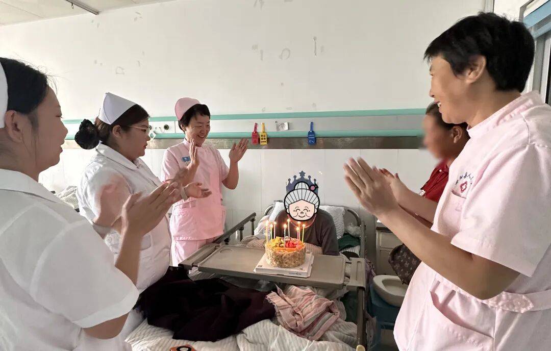 2025年9月21日上午11时,医养结合科404房间的门被轻轻推开,一阵温馨而熟悉的《生日快乐》旋律缓缓流淌——这是科室医护人员陪伴张奶奶度过的第十个生日。原本平静躺着的张奶奶,似乎被熟悉的旋律唤醒,缓缓睁开眼睛,目光在人群中流转。当看到女儿熟悉的脸庞,听到医护人员亲切的祝福时,她的眼角慢慢湿润,晶莹的泪光在眼眶中闪烁,虽然无法用语言表达,但这抹泪光,早已是对大家最好的回应。