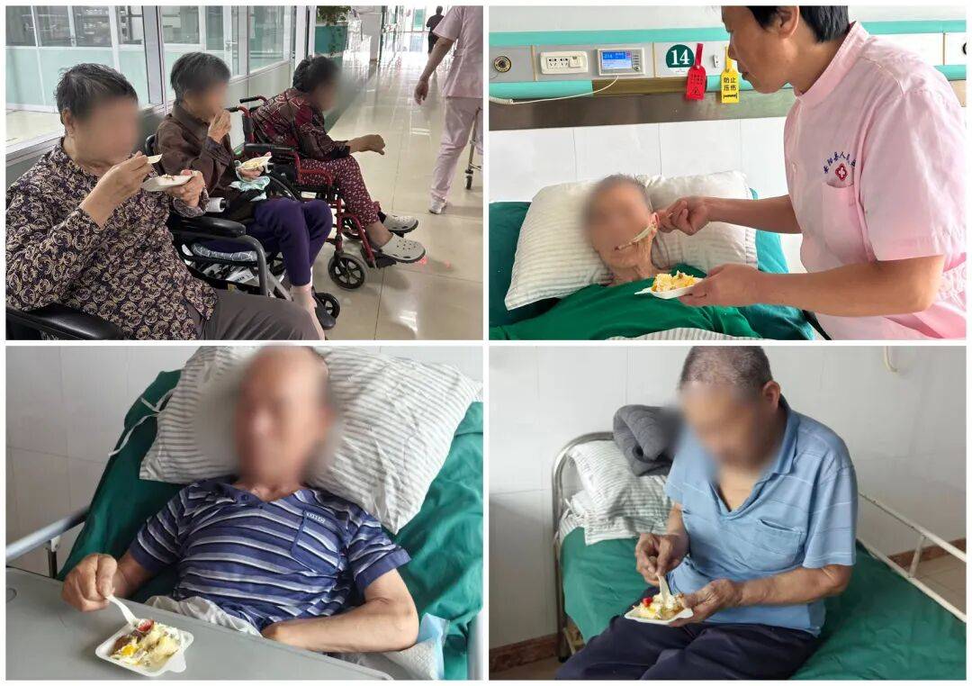 歌声结束后,护理人员小心翼翼地将蛋糕切成小块。“奶奶,尝尝蛋糕,不甜,很软的。”护士轻声说着,用小勺舀起一小块蛋糕胚,慢慢送到张奶奶嘴边。张奶奶微微张开嘴,细细咀嚼着,嘴角不自觉地向上扬起一丝弧度。随后,医护人员又将蛋糕分装到小碟子里,逐一送到科室其他能正常进食的老人手中。