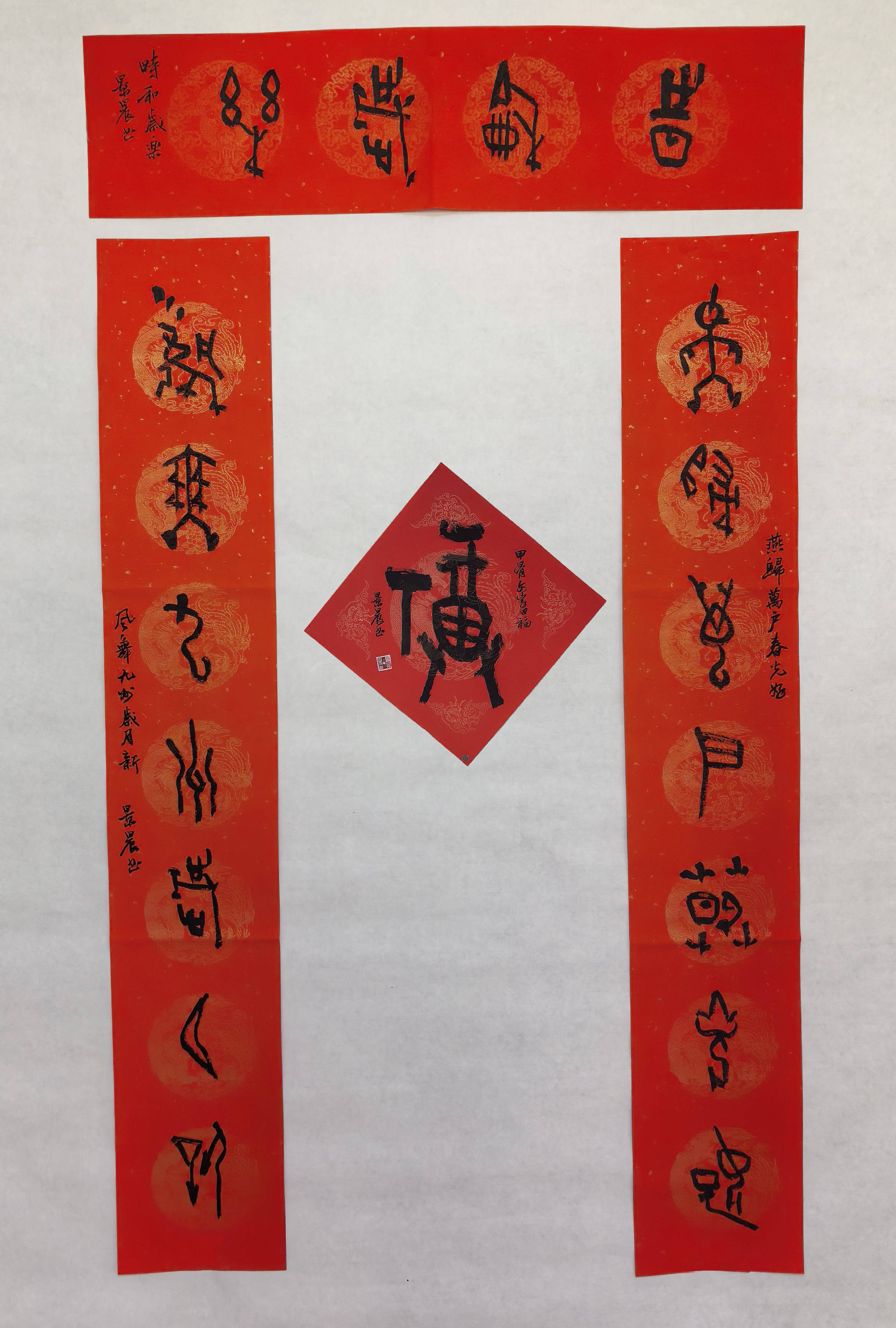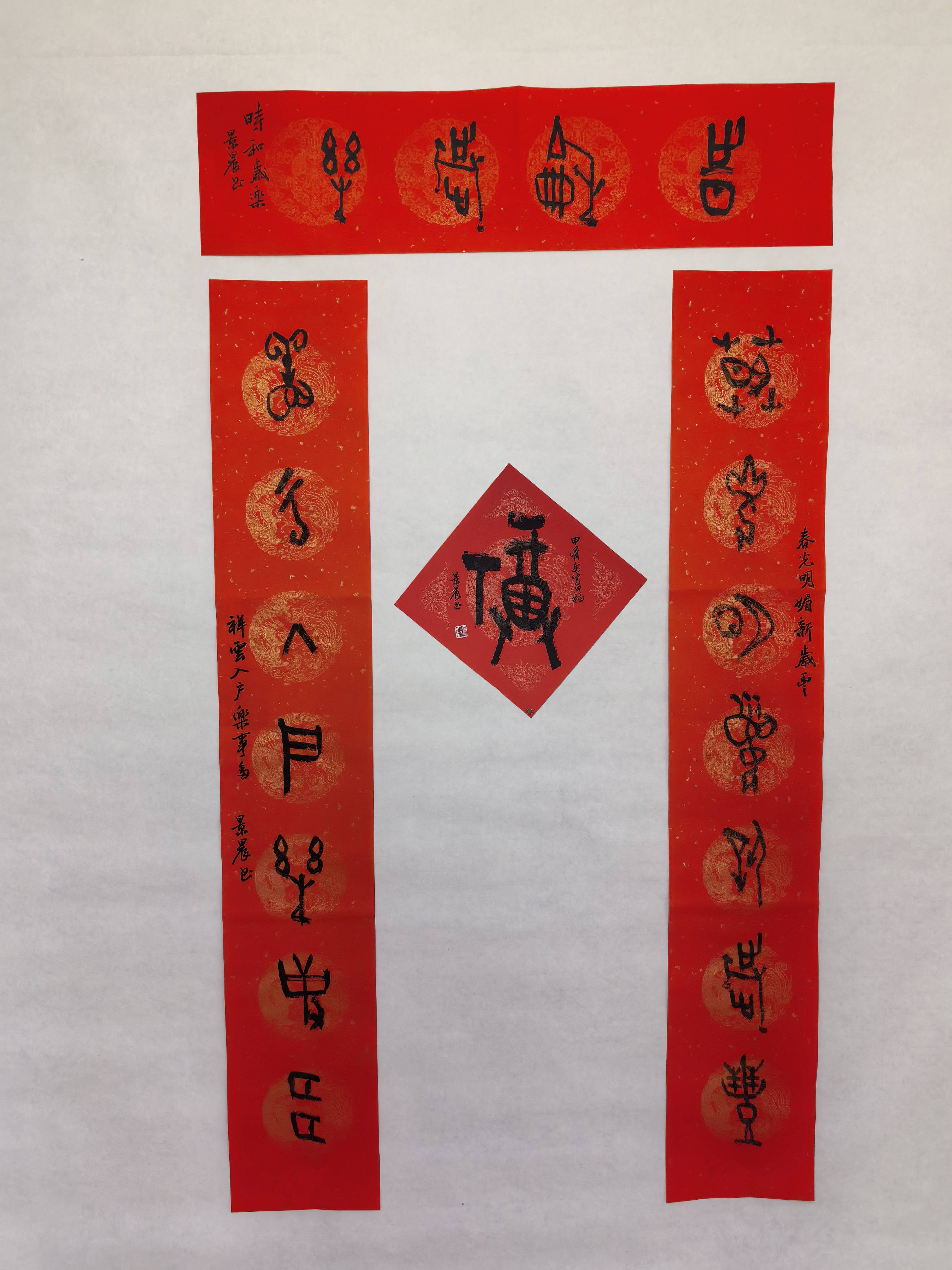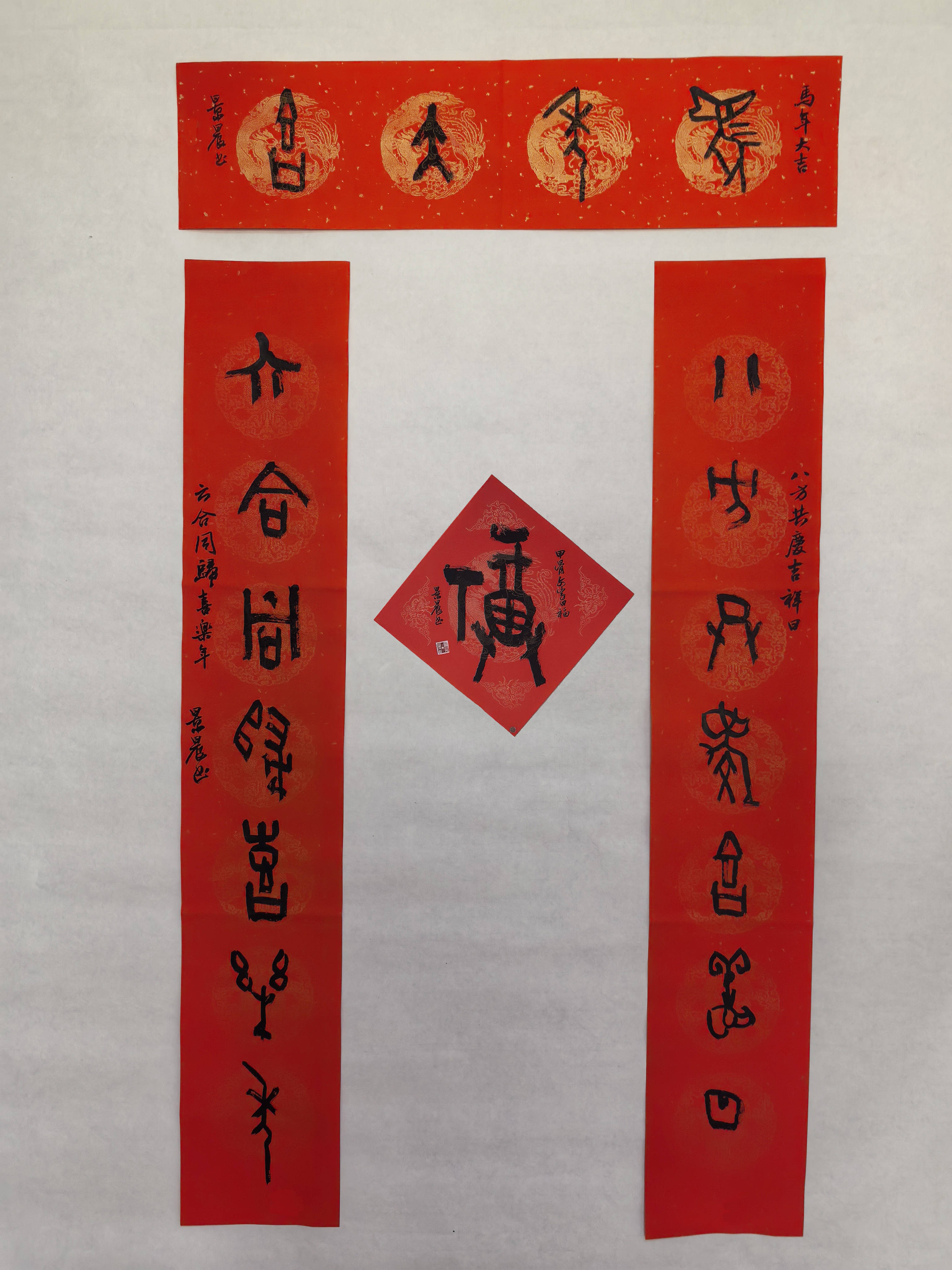 春节贴春联,是中国人延续千年的民俗传统;甲骨文,是中华文明绵延不绝的文字密码。吴景晨先生以甲骨文书春联,恰是将传统民俗与文化根脉交织,让新春的喜庆多了一份历史的厚重,让古老的文字焕发了时代的生机。在他的笔墨之下,每一个甲骨文字都成了文化的载体,每一副春联都是一次文明的对话——三千年前的殷商先民以甲骨记事,今日艺术家以甲骨贺岁,文脉传承,薪火不息。