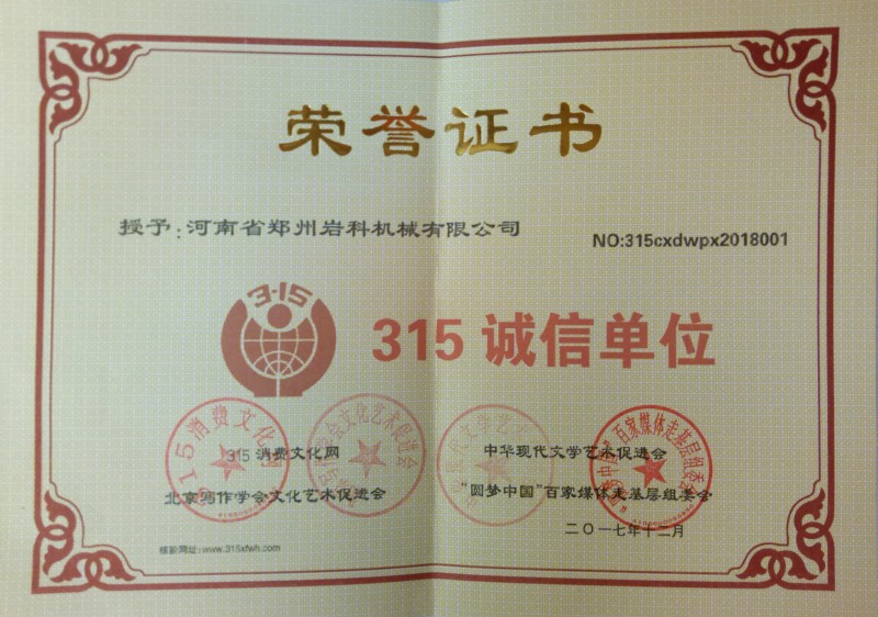 热烈祝贺郑州岩科机械有限公司被推选为“315诚信单位”