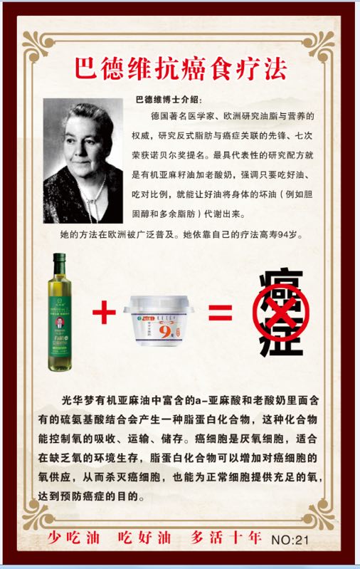 这样简单的治疗,能产生如此卓著的效果,与其中的亚麻油发挥功效有着重大的关系。亚麻是世界公认的α-亚麻酸和木酚素含量最高的植物,而α-亚麻酸和木酚素是预防和治疗癌症的最佳搭档,其抗癌功效举世公认。1967年,巴德维博士在接受德国南部电台网络访问时谈及她的病人都是在手术和电疗失败后才来找她的,即使是濒临死亡,在接受α-亚麻酸和乳酪疗法之后,最多几个月大约90%的病人都能够恢复健康。